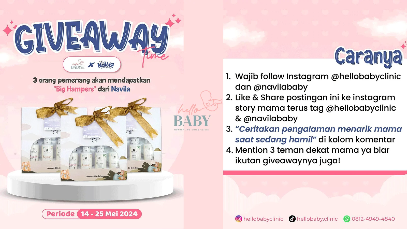 Giveaway yang berlangsung dari tanggal 14 hingga 25 Mei 2024 ini mengharuskan para peserta untuk mengikuti beberapa langkah, termasuk mengikuti akun Instagram @hellobabyclinic dan @navilababy, membagikan postingan giveaway ke Instagram Story mereka, dan menandai tiga teman dekat agar ikut berpartisipasi. Setelah periode giveaway berakhir, tiga pemenang beruntung yang terpilih adalah: